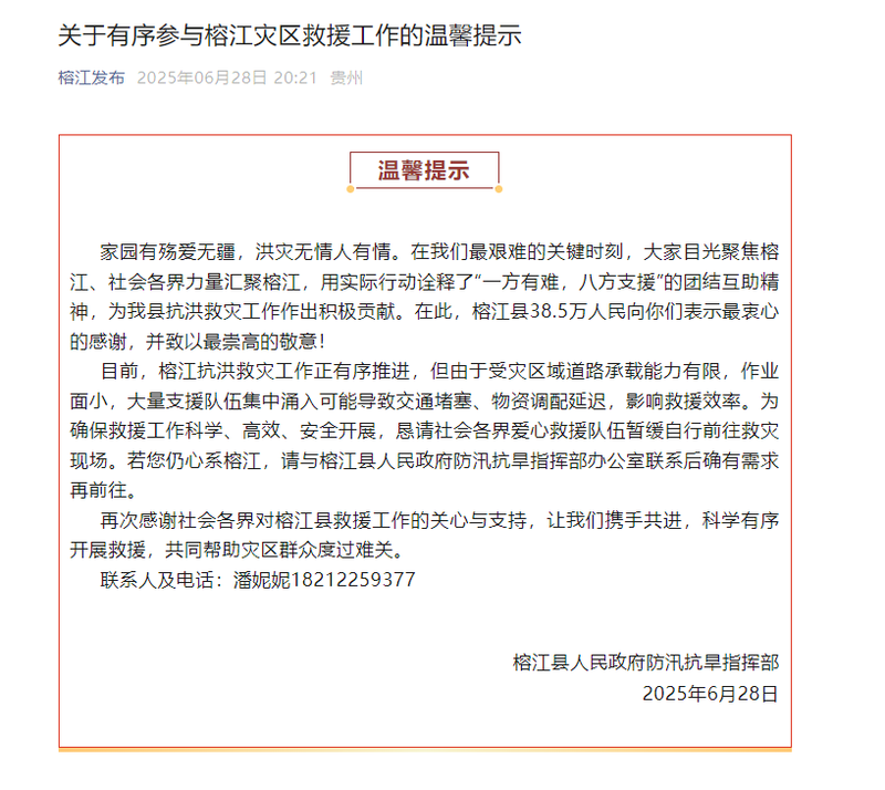 目前,榕江抗洪救灾工作正有序推进,但由于受灾区域道路承载能力有限,作业面小,大量支援队伍集中涌入可能导致交通堵塞、物资调配延迟,影响救援效率。为确保救援工作科学、高效、安全开展,恳请社会各界爱心救援队伍暂缓自行前往救灾现场。若您仍心系榕江,请与榕江县人民政府防汛抗旱指挥部办公室联系后确有需求再前往。