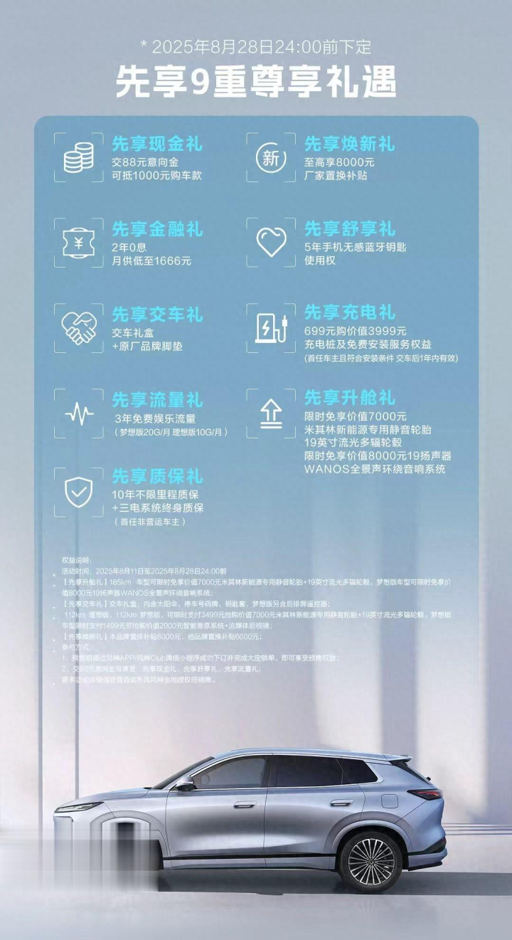 那么在这其中,作为东风奕派科技的首款全新战略车型——“东风风神L8”,这款车的出现确实给网友们带来了很大的惊喜。例如从价格上来看,东风风神L8的预售价定在了12.99万元起,这个价格对于一台轴距超过2.8米的插混SUV来讲,确实是一个令人感到惊讶的事情。当然除了这些之外,东风风神L8在预售期间还给出了9重豪礼,其中值得关注的有2年0息的金融礼,以及至高8000元的厂家置换补贴和先享升舱礼。这里值得一提的是,先享升舱礼当中涵盖了价值7000元的米其林新能源专用的静音轮胎,以及19英寸的流光多辐轮毂和价值8000元的19扬声器音响系统。